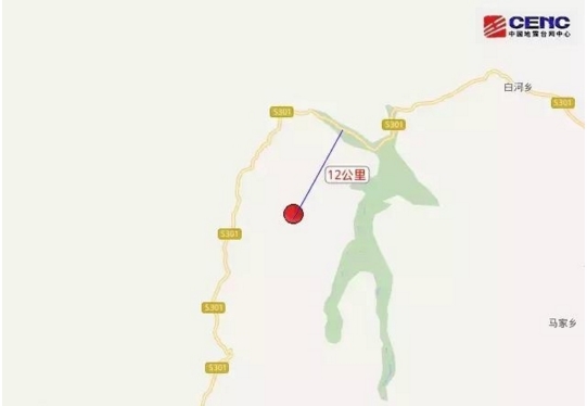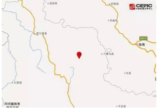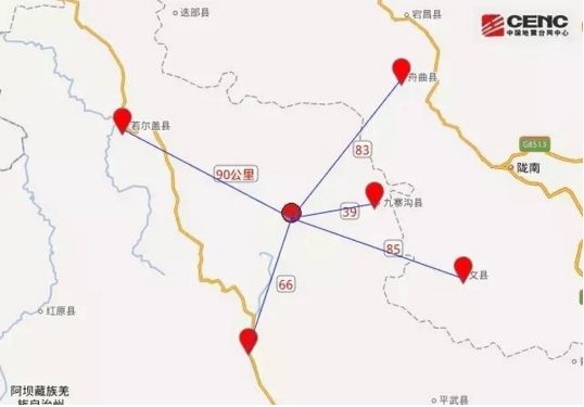 ? ?震中距九寨溝縣39公里、距松潘縣66公里、距舟曲縣83公里、距文縣85公里、距若爾蓋縣90公里,距隴南市105公里,距成都市285公里。