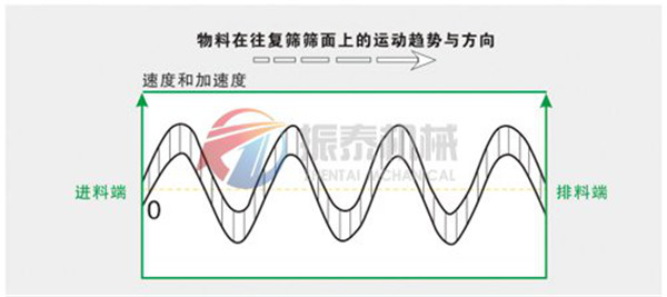 具體搖擺直線篩作業(yè)時物料的運(yùn)動軌跡與滯留時間可以通過下圖及右圖來說明: